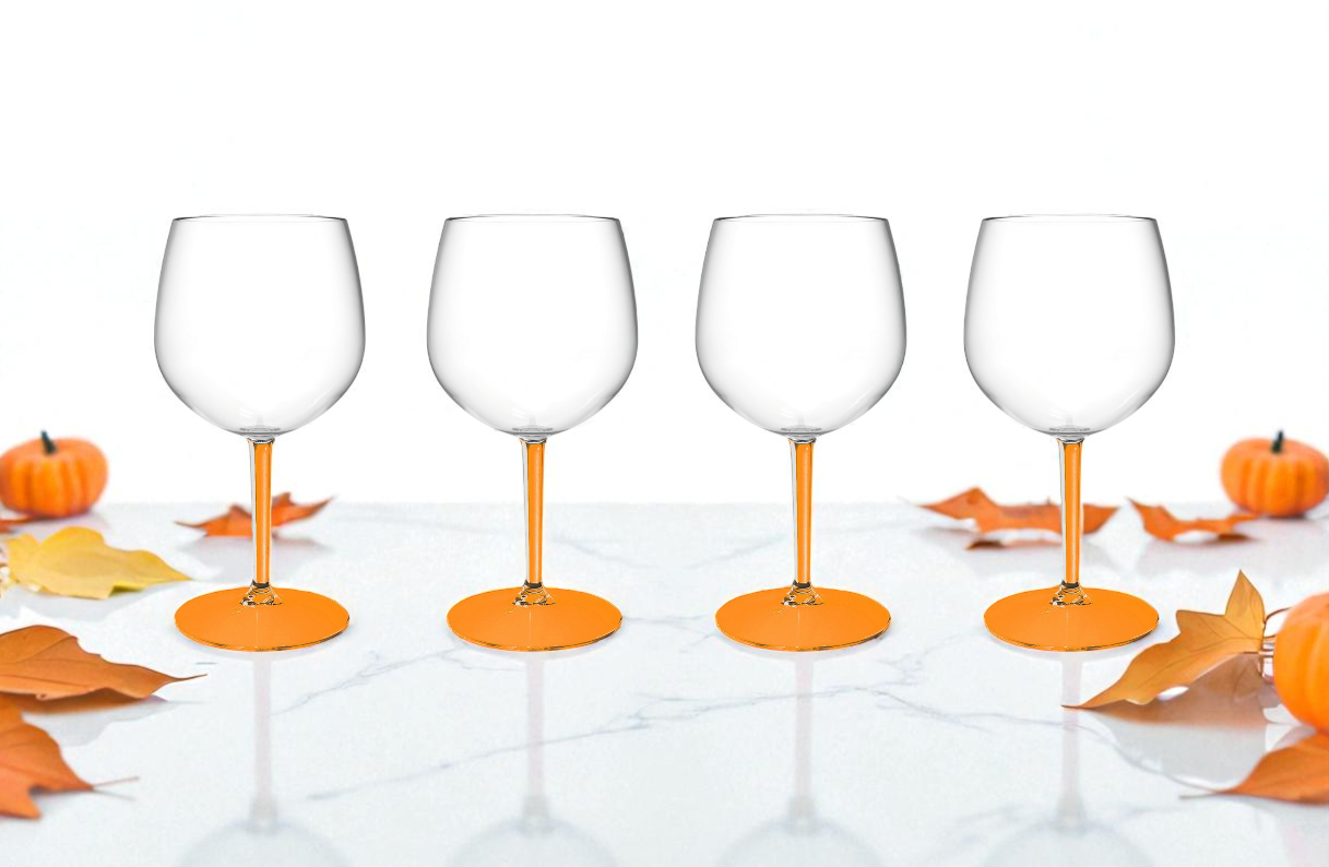 Zestaw zawiera 4 kieliszki z pomarańczową nogą, każdy o pojemności 580 ml. Wykonane z wysokiej jakości polimeru – wyglądają jak szkło, ale są w 100% nietłukące i wielorazowe.